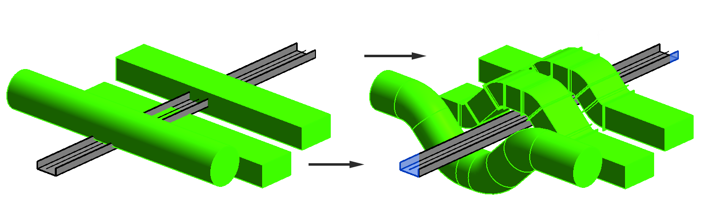 In der TGA Planung laufen sehr häufig viele Leitungen in engen Installationszonen zusammen und müssen kollisionsfrei ausgekreuzt werden. Bei manueller Modellierung gestaltet sich dies in Revit sehr aufwändig, mindestens drei Elemente (z.B. gebogene Formteile) müssen pro Kreuzungpunkt modelliert und geometrisch konfiguriert werden, um eine Leitung zu umfahren.
