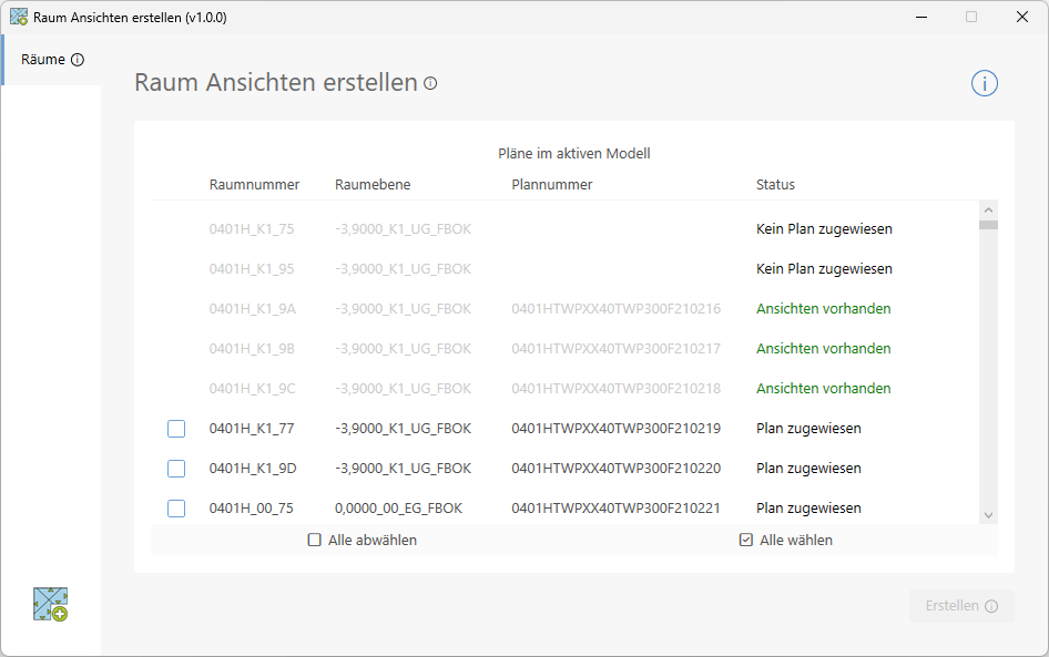 - Stellen Sie sicher, dass für alle gewünschten Räume ein Plan im Modell vorhanden ist.