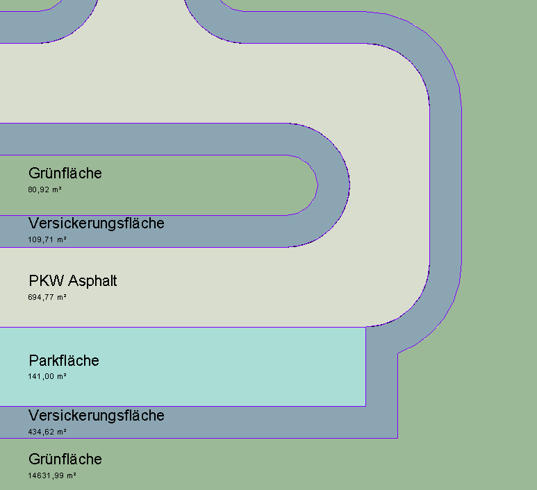 Die Verwendung des Raumflächen-Werkzeuges erfolgt wie unter der Rubrik Räume beschrieben. Als Raumkategorie für Parkplätze ist 09 VF Verkehrserschl. und -sicherung vorgesehen.