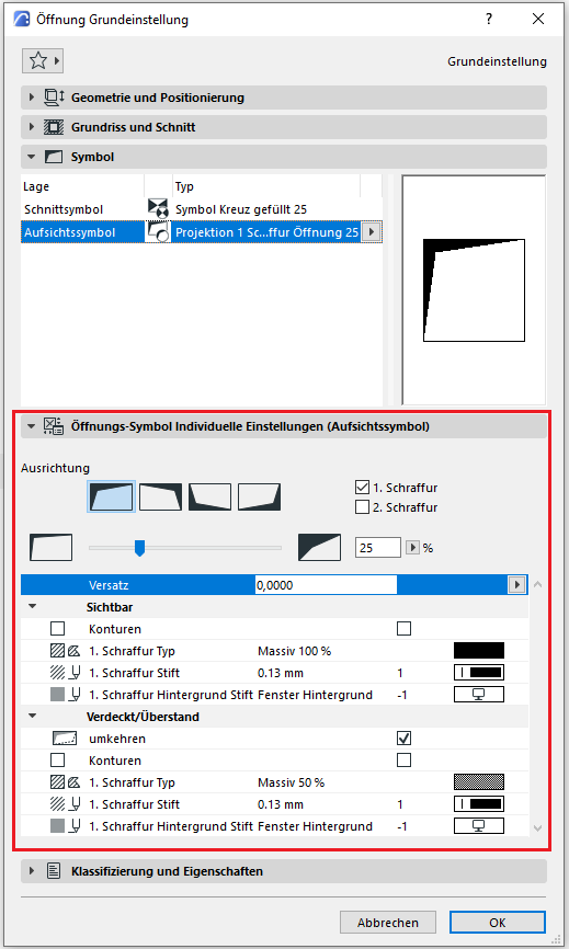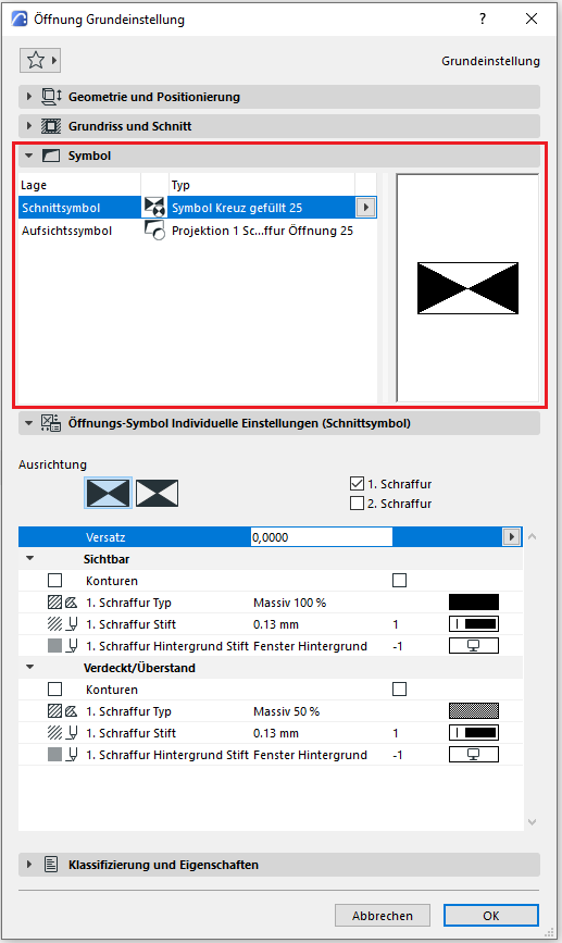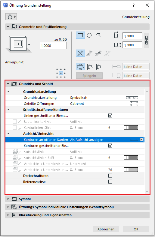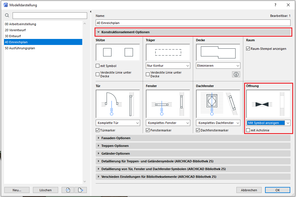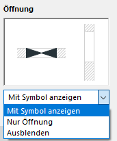 Die Einstellungen der Modelldarstellung steuern die Darstellung der Öffnungen global. Unabhängig davon, welche Grundeinstellungen vorgenommen wurden, steuern die Modelldarstellungsoptionen die Optik des Elementes. Öffnen Sie das Dialogfenster der Modelldarstellung in dem Menüpunkt