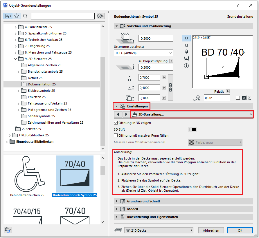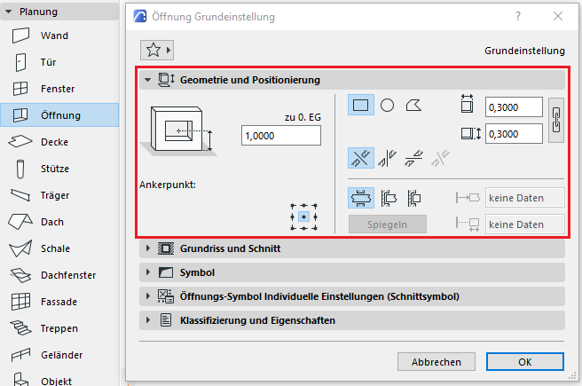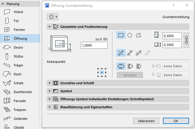 Durch Verwendung dieser Befehle kann zwar die Öffnung in einem Bauteil auf sehr einfache Weise erstellt werden, jedoch ist einerseits eine zugehörige, dynamische Beschriftung und andererseits auch eine für diese Bauteile typische Grundriss-Symbolik nicht abrufbar. Aufgrund dieser Tatsache ist letztendlich die zweite Erstell-Methode zu empfehlen: