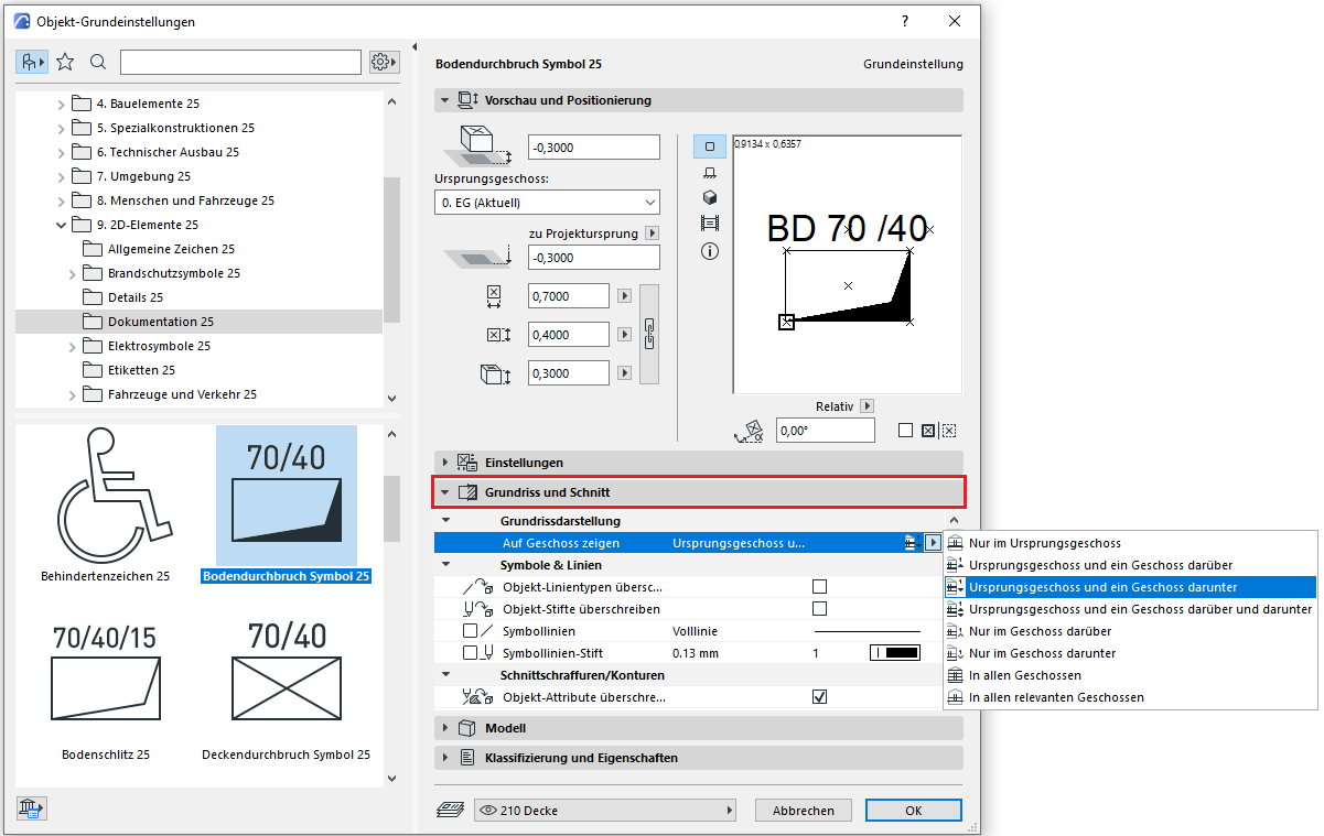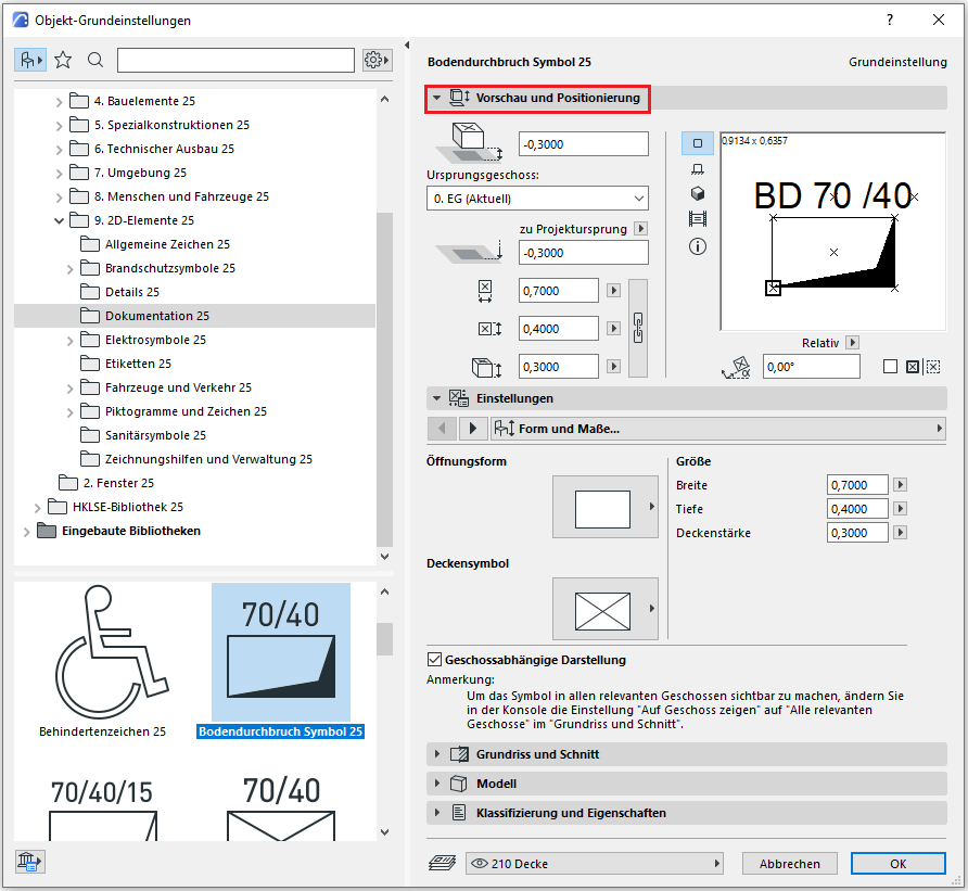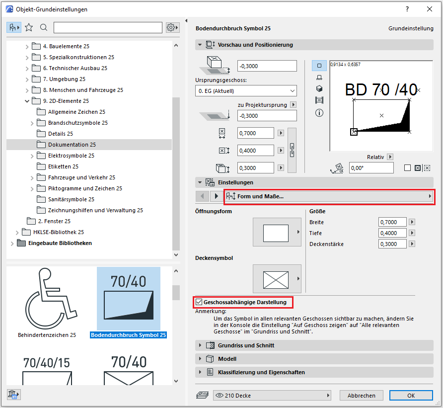 Objekte für Durchbrüche/Nischen/Schlitze werden in ihren Objekt-Einstellungen beschriftet. Darüber hinaus ist die Systematik der Beschriftung und Bemaßung immer bauelementbezogen (adaptiv).